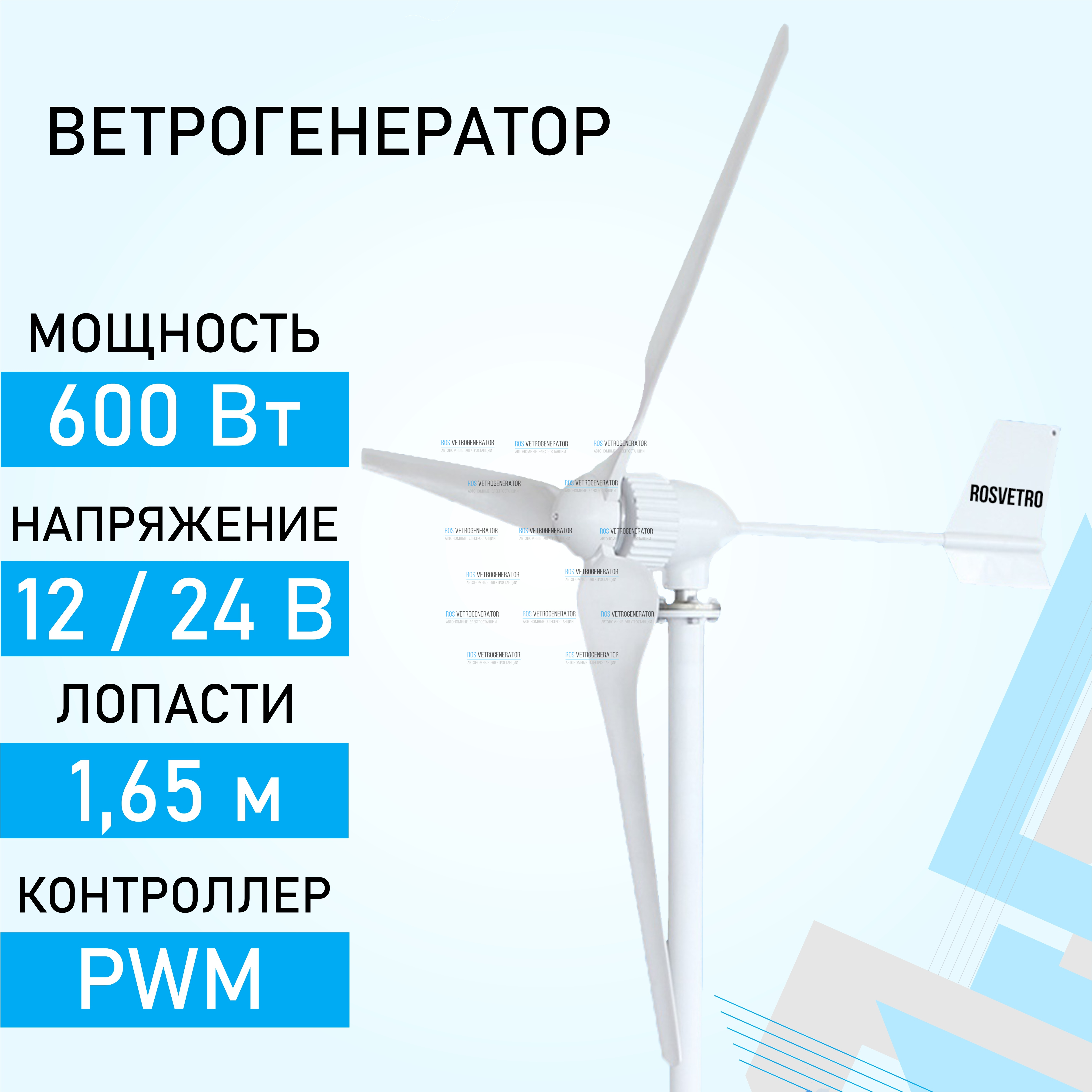 ROSVETRO SS-600 — это горизонтальный ветрогенератор номинальной мощностью 600 Вт, которая поставляется в комплекте с контроллером PWM.